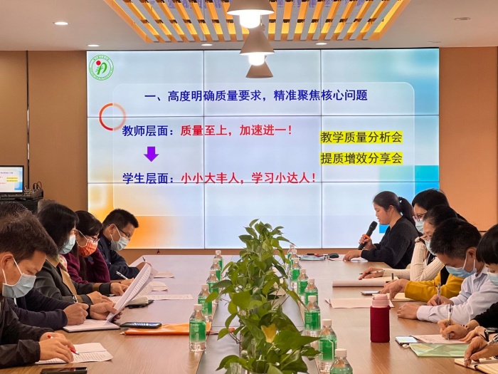 在學校五樓教研室,教學常規(guī)督導檢查組一行首先聆聽學校教務處馮秀珍主任作題為《立德樹人,提質增效》的教學工作匯報。馮主任從“高度明確質量要求,精準聚焦核心問題”“深入研讀課程標準,聚焦學科核心素養(yǎng)”“落實學習習慣養(yǎng)成,精準研究學生學法”“全面落實雙減政策,優(yōu)化課后服務工作”等十方面向督導組全面匯報了學校的教育教學工作情況。