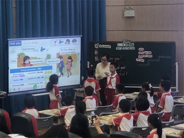 首先,由中山市實(shí)驗(yàn)小學(xué)教育集團(tuán)大豐小學(xué)王敏霞老師執(zhí)教三年級(jí)Unit 3 Look at me!第一課時(shí)A Let's talk & Let's do部分。王老師豐富的肢體語(yǔ)言及抑揚(yáng)頓挫的語(yǔ)調(diào)充分吸引了學(xué)生的注意力、調(diào)動(dòng)了他們的積極性,借助圖片、音頻、視頻等多種形式引導(dǎo)學(xué)生深入理解關(guān)鍵句型。王老師還拓展了有關(guān)繪本,拓寬學(xué)生的知識(shí)面,引導(dǎo)學(xué)生學(xué)會(huì)表達(dá)自己的感受,升華了學(xué)會(huì)愛自己、愛他人,用語(yǔ)言表達(dá)愛的主題。
