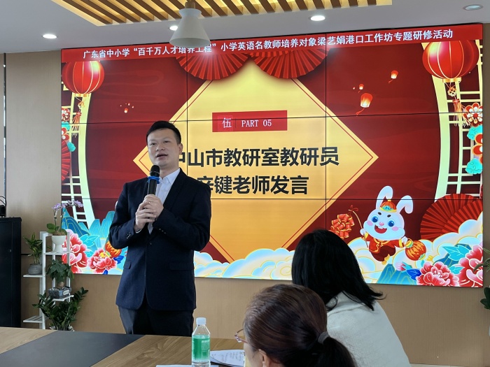緊接著,與會領導嘉賓做表態(tài)性發(fā)言。廣東省外語藝術職業(yè)學院譚偉民教授肯定了工作坊開展的豐富多彩的研修活動以及取得的優(yōu)異成績。在會上他作了題為《指向核心素養(yǎng)的英語課程教學改革路徑探索》的微講座,深入淺出地為港口工作坊成員的教學和研究指明了方向。中山市教育教學研究室小學英語教研員辛鍵老師祝賀港口工作坊取得豐碩的階段性成果,勉勵學員們要勤學善思,躬體力行,期待大家佳績頻傳。港口鎮(zhèn)教育和體育事務中心張育文主任作了最后總結發(fā)言,鼓勵大家面對不足,越戰(zhàn)越勇,為港口教育作出實在的成績。
