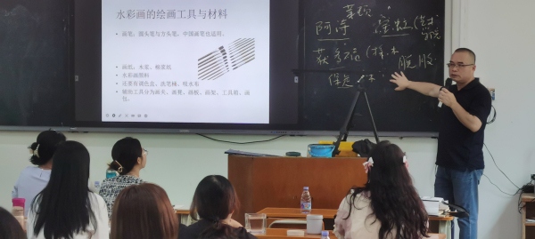 活動(dòng)第一環(huán)節(jié)是專題講座,由大南中學(xué)美術(shù)教師蘭佳革向與會(huì)老師們?cè)敿?xì)講解了水彩畫的發(fā)展歷史、繪畫材料特點(diǎn)、作畫方法及特殊表現(xiàn)特技。他的講座深入淺出,迎來了陣陣掌聲。