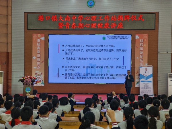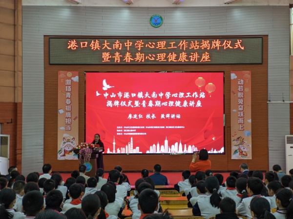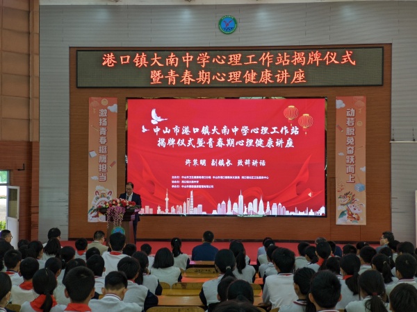 為扎實(shí)推進(jìn)健康中國、教育強(qiáng)國建設(shè),關(guān)注學(xué)生心理健康,積極開展校園心理咨詢服務(wù)工作,2023年2月9日上午,由港口鎮(zhèn)大南中學(xué)德育處主任許春娜主持的港口鎮(zhèn)大南中學(xué)心理工作站揭牌儀式暨青春期心理健康講座在學(xué)校一樓階梯室舉行,中山市第三人民醫(yī)院院長蔣廷云、中山市港口鎮(zhèn)人民政府副鎮(zhèn)長易昊宏、許策明,中山市衛(wèi)生健康局港口分局局長吳中明、中山市港口鎮(zhèn)教體文旅局副局長劉長路、中山市港口鎮(zhèn)教育和體育事務(wù)中心主任張育文、中山市港口鎮(zhèn)大南中學(xué)校長廖建紅、中山市港口鎮(zhèn)社區(qū)衛(wèi)生服務(wù)中心副主任盧永添、中山市第三人民醫(yī)院青少年心理專家張世寧出席本次活動。
