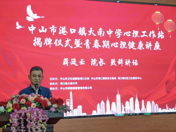 緊接著中山市第三人民醫(yī)院院長蔣廷云致辭。蔣院長對港口鎮(zhèn)政府能盡早開展心理工作站的做法表示由衷的敬佩,他表示心理工作站的成立,也是為心理健康提供一個宣傳的平臺,讓更多的學(xué)生和家長知道,心理問題不可怕,可怕的是沒有得到處理。沒有全民健康,就沒有全面小康。