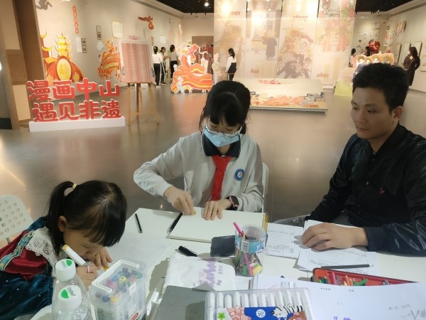 本次親子活動分為觀展環(huán)節(jié)、藝術(shù)實(shí)踐和活動訪談幾個部分。首先大家跟隨展館講解員的介紹去了解中國漫畫的發(fā)展歷史和中山籍漫畫名家及其代表作,隨后大家又興趣盎然地探究起“漫畫中山 遇見非遺”展廳內(nèi)的每一項(xiàng)中山非遺文化,同學(xué)們通過解讀文字、欣賞漫畫的方式與家長一起分享自己所思所感。展覽現(xiàn)場設(shè)置的富有趣味的打卡互動裝置,更是激發(fā)了同學(xué)們深入了解中山非遺文化的熱情。在接下來的臨摹和寫生環(huán)節(jié),鄢婷、李尚雅、李振華三位美術(shù)老師分別對孩子們進(jìn)行了現(xiàn)場指導(dǎo),同學(xué)們表現(xiàn)出極大的熱情和表現(xiàn)欲。最后,課題組談喜金和余麗苑老師針對本次美育實(shí)踐活動進(jìn)行了親子訪談,家長們紛紛表示:此次親子美育活動非常有意義,不僅讓我們對中山非遺文化有了進(jìn)一步的了解,更是感受到中山非遺文化的獨(dú)特魅力和時代價值。