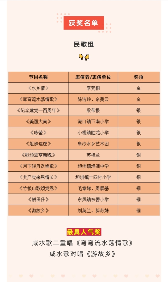 由中山市文化廣電旅游局主辦的2021年中山市民歌民樂大賽分初賽和決賽,港口鎮(zhèn)下南小學的《美麗大南》節(jié)目在港口鎮(zhèn)政委的大力支持下,拍攝了視頻參加初賽,在46個參賽節(jié)目中脫穎而出進入決賽,在8月21日下午在南朗街道崖口村社區(qū)綜合文化服務中心舉辦的決賽中,下南小學在激烈的角逐中嶄露頭角,榮獲銀獎,可喜可賀。