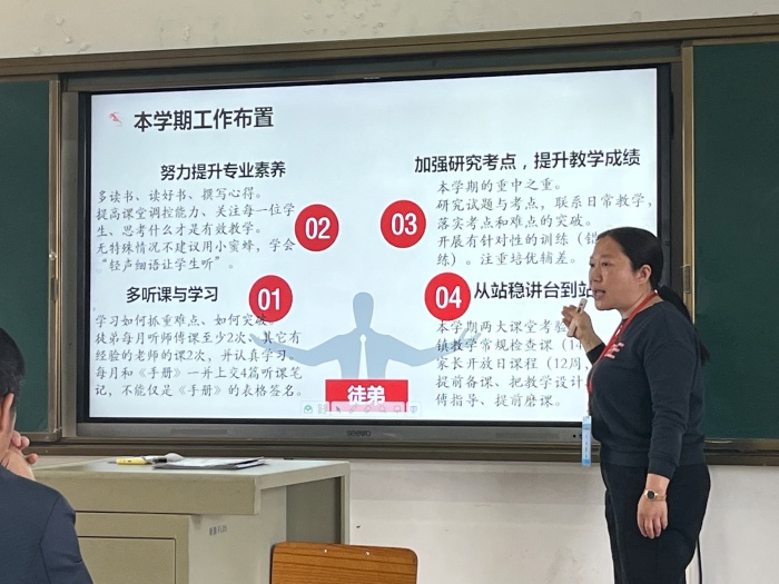 接著,徐校長布置本學(xué)期“青藍(lán)工程”工作安排。徐校長指出師傅要繼續(xù)幫助青年教師快速成長,既要在工作中不斷提醒、引導(dǎo)徒弟開展各項工作,又要發(fā)揮示范作用,為徒弟做楷模;同時,她還強(qiáng)調(diào)青年教師要珍惜機(jī)遇,謹(jǐn)記師傅的教誨,虛心學(xué)習(xí)、主動求教、扎實工作,盡快提高教學(xué)業(yè)務(wù)水平,實現(xiàn)從站穩(wěn)講臺到站好講臺的目標(biāo)。