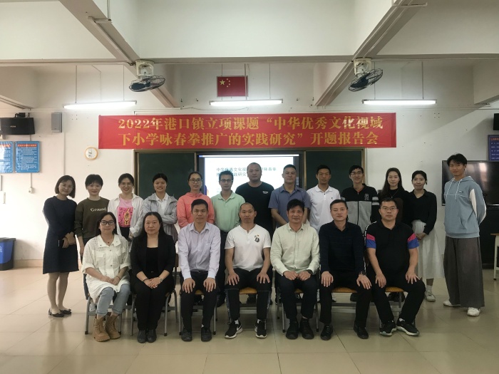 春回大地、草長鶯飛。在春意盎然的四月里,港口鎮(zhèn)西街小學(xué)迎來了教研工作的一大喜事——港口鎮(zhèn)2022年立項課題“中華優(yōu)秀文化視域下小學(xué)詠春拳推廣的實踐研究”如期開題了。4月6日上午,開題報告論證會在西街小學(xué)多媒體室召開。出席本次論證會的專家有港口鎮(zhèn)教育和體育事務(wù)中心陳樹洪老師、港口鎮(zhèn)民主小學(xué)桂玉盛主任和港口鎮(zhèn)石特小學(xué)陳國文老師。會議由西街小學(xué)徐艷麗副校長主持,西街小學(xué)梁容根校長、課題組成員及體藝科組全體老師參加了會議。