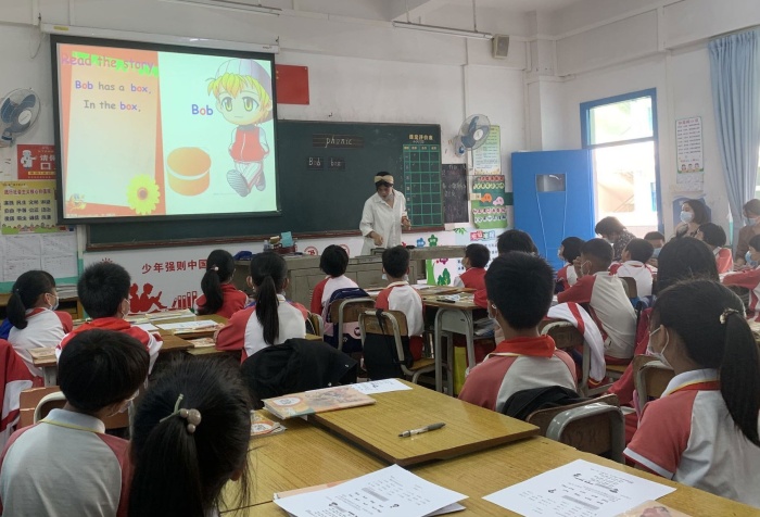 教務(wù)主任楊雨展示了三年級元音字母[?]發(fā)音的語音拓展課。鑒于三年級的學(xué)生活潑好動,模仿意識強,楊主任在課前利用字母操讓學(xué)生重溫了26個字母的發(fā)音。通過Bob和Tod這兩個孩子的小故事以舊引新,通過模仿聆聽、觀察感悟、實踐運用,開展字母O的語音教學(xué)。學(xué)生們在小組內(nèi)進(jìn)行發(fā)音練習(xí),在合作中提升自我。