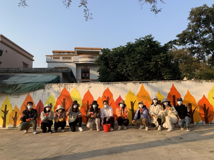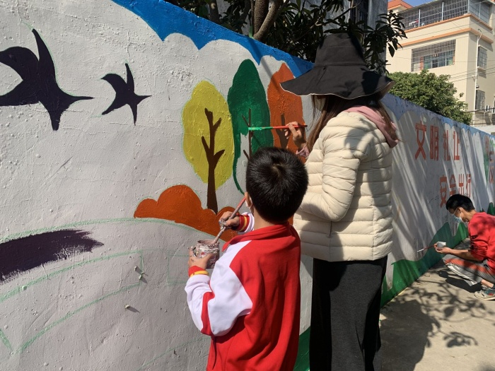 活動前期,學校行政和美術(shù)教師積極研討方案、確定主題,并對墻體進行總體設計并打好了框架,最終確定了將港口鎮(zhèn)特色的落羽杉林、港口鎮(zhèn)卡通形象“杉杉”和“蓮蓮”、中南小學吉祥物“中中”和“南南”融入到交通安全知識和垃圾分類等宣傳欄中。