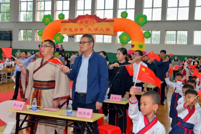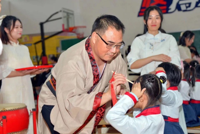 孩子們身穿漢服,在老師的帶領(lǐng)下洗凈雙手,再拱手穿越啟智門。行大禮前,凈手以凈其心,寓意著孩子們?cè)诔砷L(zhǎng)過程中洗去浮躁、稚氣、留下睿智與儒雅。拱手穿越啟智門,象征著孩子們從今啟智,學(xué)習(xí)尚禮、立志“博學(xué)篤志,切問而近思,做有理想之人,有德性之人,有文化之人”。