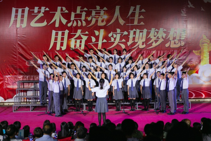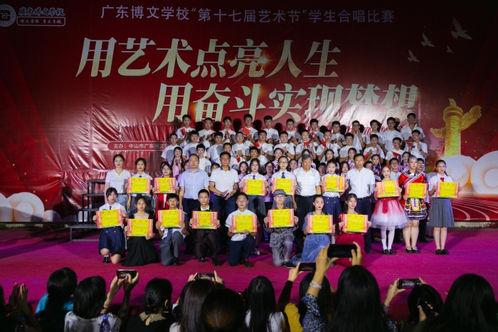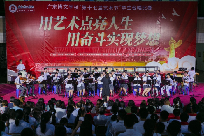 用藝術(shù)點(diǎn)亮人生,用奮斗實(shí)現(xiàn)夢(mèng)想。為進(jìn)一步激發(fā)師生愛(ài)國(guó)熱情,弘揚(yáng)民族精神,活躍校園文化氣氛,讓學(xué)生養(yǎng)成對(duì)藝術(shù)的愛(ài)好和有一種藝術(shù)特長(zhǎng)陪伴終身,廣東博文學(xué)校第十七屆藝術(shù)節(jié)初中部學(xué)生主題合唱比賽經(jīng)過(guò)緊張有序的籌備在學(xué)校星星舞臺(tái)如期舉行。