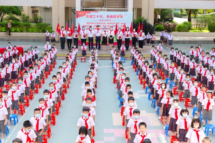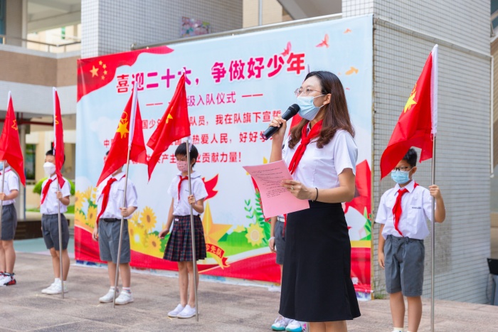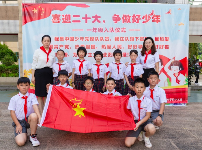 在中國共產(chǎn)黨第二十次全國代表大會即將召開之際,廣東博文學(xué)校少工委在學(xué)校黨支部的帶領(lǐng)下,積極完善關(guān)于構(gòu)建少先隊(duì)員階梯式成長的激勵體制,旨在增強(qiáng)少先隊(duì)員的光榮感和使命感。廣東博文學(xué)校少工委于2022年6月1日莊嚴(yán)舉行“喜迎二十大,爭做好少年”一年級入隊(duì)儀式暨紅領(lǐng)巾獎?wù)聽幷禄顒訂觾x式。本次入隊(duì)儀式以喜迎黨的二十大為契機(jī),讓隊(duì)員們在熱愛少先隊(duì)的同時,傳承紅色文化、弘揚(yáng)革命精神,滋養(yǎng)隊(duì)員們愛黨、愛國、愛校、愛家的情懷。