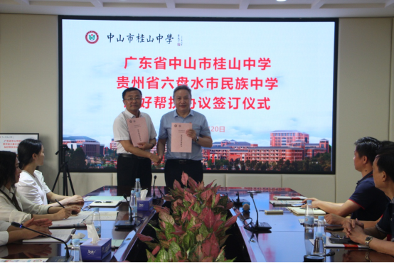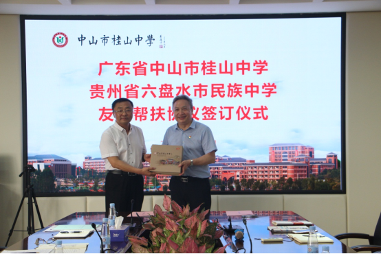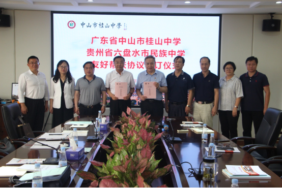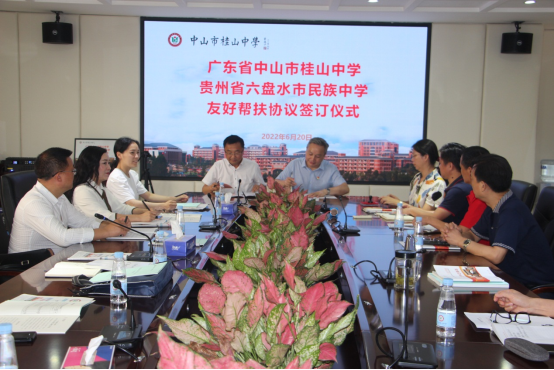 為貫徹落實《中山市教育和體育局六盤水市教育局關于做好2022年東西部協(xié)作學校結對幫扶工作的通知》精神,充分發(fā)揮教育優(yōu)質資源的輻射帶動作用,根據(jù)《廣東省中山市 貴州省六盤水市對口幫扶教育協(xié)作協(xié)議》等文件要求,2022年6月20至22日,桂山中學黨委書記、校長董再明等班子成員熱情接待了貴州省六盤水市民族中學黨委書記、校長薛宗偉一行8人并于20日舉行了結對幫扶的簽約儀式。