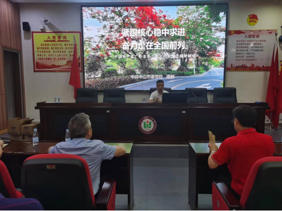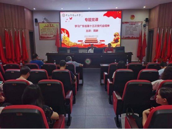 2022年6月17日,中共中山市桂山中學(xué)委員會開展6月份主題黨日活動。本次活動邀請中共中山市委黨校周耕教授給全體黨員講授學(xué)習(xí)貫徹廣東省第十三屆黨代會精神的專題黨課?;顒釉谟t樓一樓黨員會議室舉行,由黨委副書記陳福生主持。