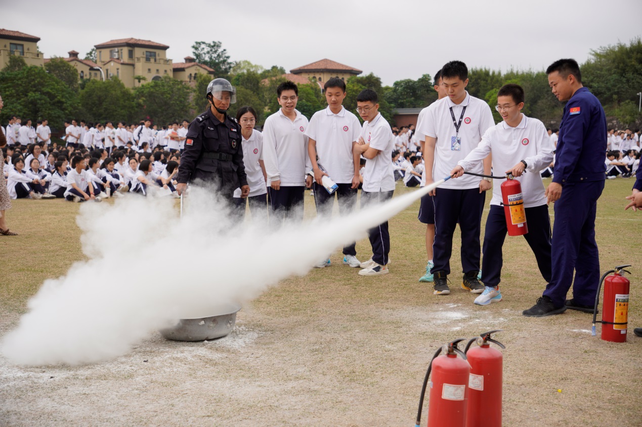 6分鐘后,全體師生撤離到安全地點集合完畢,德育處副主任陳建科作為活動指揮引導(dǎo)同學(xué)們開展消防演練。三鄉(xiāng)消防分局消防員唐文龍講解了滅火器的使用方法,提醒同學(xué)們要分清楚常規(guī)滅火器的使用范圍,并一步步教授同學(xué)們?nèi)绾握_使用滅火器。參與演練的同學(xué)認真學(xué)習安全防護方法,并爭先恐后排隊進行實操。副校長陳福生代表學(xué)校感謝消防官兵們的生動教學(xué),希望同學(xué)們在玩得開心之余,認真學(xué)習理論知識,強化實操演練,成為自己生命安全的守護者。他表示,“當災(zāi)難來臨之時,我們都躲不掉逃不掉,只能加強演練,才是守護生命安全的最好方式。在日常生活中,我們要珍愛生命,做自己生命的第一責任人;要珍愛生命,學(xué)會用生命守護生命;要珍愛生命,守護意識形態(tài)安全。”