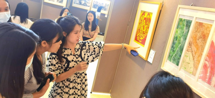 展廳內(nèi),在劉老師的個(gè)人作品《是自然的饋贈(zèng)》前,同時(shí)也駐足許多前來(lái)交流的各校教師,各校之間關(guān)于專業(yè)技法與少兒版畫教學(xué)的探討,使這次的聯(lián)展交流氛圍愈加濃烈。