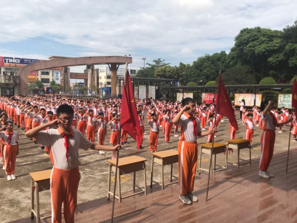 看!火紅的隊(duì)旗高高飄揚(yáng),指引我們前進(jìn)的方向。瞧!鮮艷的紅領(lǐng)巾系滿理想,載著同學(xué)們揚(yáng)帆遠(yuǎn)航。聽(tīng)!那莊嚴(yán)的呼號(hào),像黎明的鐘聲,伴著少先隊(duì)員們茁壯成長(zhǎng)。首先,同學(xué)們出旗,唱隊(duì)歌,接著,大隊(duì)輔導(dǎo)員陳曉瑜老師宣布新隊(duì)員名單,然后,老隊(duì)員為一年級(jí)的新隊(duì)員佩戴紅領(lǐng)巾??粗⒆觽冃厍帮h動(dòng)的紅領(lǐng)巾,老師們感到無(wú)比的幸福和自豪,愿孩子們胸前的紅領(lǐng)巾能時(shí)刻激勵(lì)著大家取得一個(gè)又一個(gè)進(jìn)步。在莊嚴(yán)的隊(duì)旗下,少先隊(duì)大隊(duì)長(zhǎng)孫芷妍同學(xué)帶領(lǐng)全體少先隊(duì)員高舉右手,大聲宣誓。