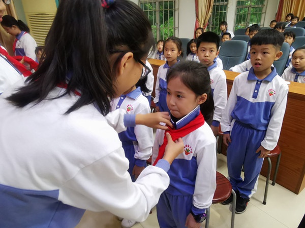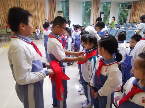 儀式在嘹亮的隊(duì)歌中拉開(kāi)序幕, 同學(xué)們?cè)诖箨?duì)輔導(dǎo)員鐘捷婷老師的指揮下高唱隊(duì)歌,“我們是共產(chǎn)主義接班人,繼承革命前輩的光榮傳統(tǒng)……”嘹亮的歌聲表達(dá)了同學(xué)們對(duì)少先隊(duì)組織的向往與熱愛(ài)。當(dāng)老隊(duì)員親手把紅領(lǐng)巾戴在31名新隊(duì)員的胸前,新隊(duì)員的那份激動(dòng)與驕傲無(wú)以言表。