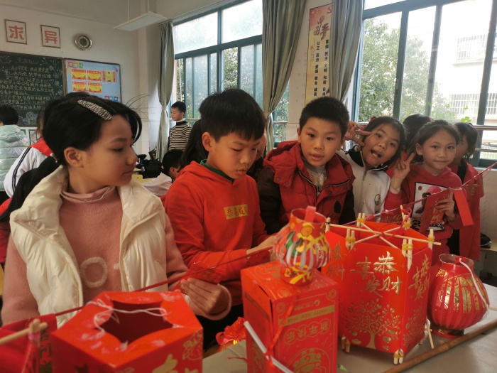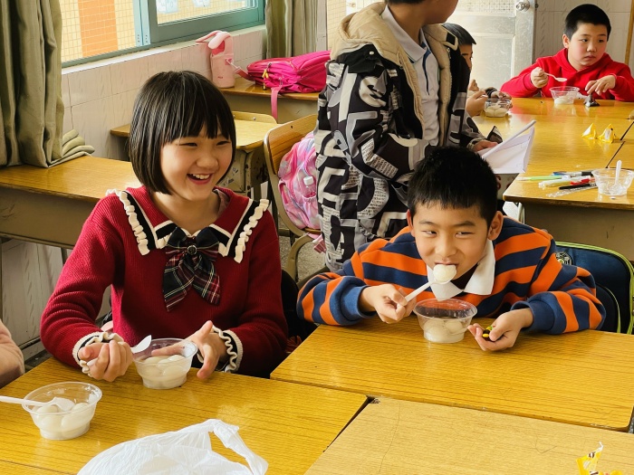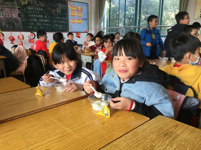 有的班級穿上節(jié)日的盛裝,手里拿著親手制作的彩燈,興高采烈進行合影。有的班級舉行猜燈謎活動,內(nèi)容涉及動物、植物、日常用物、字謎、成語……大伙兒都爭先恐后地猜起謎語來,興致高漲,有的三五成群,有的和同學結伴商量或駐足凝神,或喃喃自語,或熱烈討論,或歡呼雀躍,孩子們領到喜愛的獎品樂滋滋。五六年級的同學們紛紛卷起袖子,準備餡料,拿著面團高高興興地搓著小圓子、學著包湯圓,“湯圓好好吃……”,整個過程充滿了元宵節(jié)祥和溫馨的氣氛,一碗碗元宵,盛滿了甜蜜。