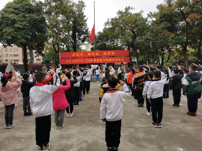 踏著春的腳步,迎著和煦的春風(fēng),懷著對新學(xué)期美好的憧憬,2月14日上午,古三小學(xué)全體師生齊聚一堂,舉行了“新起點 新目標 新輝煌”春季開學(xué)典禮,古鎮(zhèn)鎮(zhèn)教育和體育事務(wù)中心余明麗老師也來到學(xué)校實地督導(dǎo)檢查開學(xué)情況,校園里歡聲笑語,熱鬧非凡。小廣場上空響起了嘹亮的國歌聲,鮮艷的五星紅旗冉冉升起,在莊嚴的升旗儀式中,古三小學(xué)春季開學(xué)典禮拉開了帷幕。