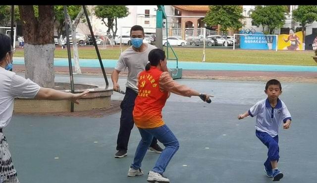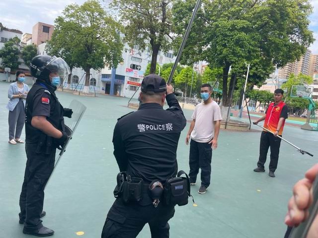 演練開始,學校模擬下午4:10學生如常下課,在操場上玩耍嬉戲,因保安員個人原因離開保安室忘記關(guān)上南門鐵閘門,有一滋擾者(為輕度精神病患者)突然闖入,神色兇兇,正向有學生的方向跑。保安員持械立即上前制止,與滋擾者對峙;另一名保安員立即按響一鍵報警系統(tǒng)向市110指揮中心報案及校園危險警報信號。