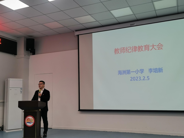 為深入貫徹落實(shí)全面從嚴(yán)治黨要求,進(jìn)一步嚴(yán)明紀(jì)律規(guī)矩,切實(shí)轉(zhuǎn)變工作作風(fēng),打造忠誠(chéng)干凈肯擔(dān)當(dāng)?shù)慕處熽?duì)伍,營(yíng)造風(fēng)清氣正的育人環(huán)境,2023年2月5日,在正式開(kāi)學(xué)的前一天,海洲第一小學(xué)組織全體教師在學(xué)校報(bào)告廳召開(kāi)紀(jì)律教育大會(huì),會(huì)議由副校長(zhǎng)李培新主持。