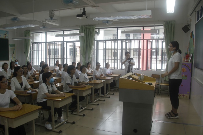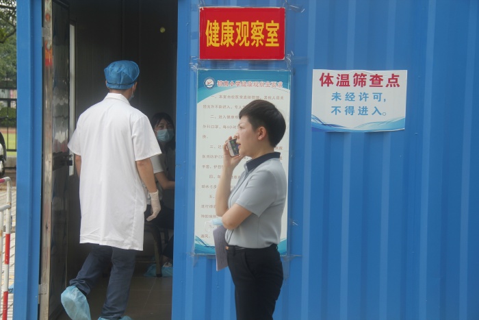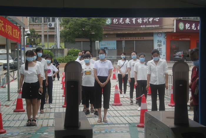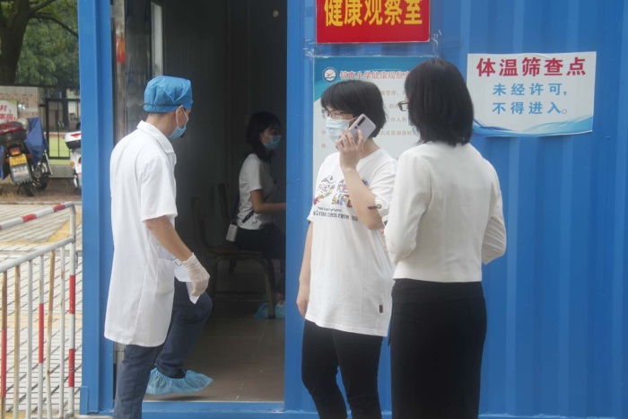 上午9點(diǎn),全體教職工身著白色上衣,黑色下裝整齊在校門口等候進(jìn)行返校入門測溫演練。參與晨檢的人員分通道按一米以上間隔排隊(duì),進(jìn)行消毒、體溫檢測,做好學(xué)生晨檢準(zhǔn)備。值日老師和保安負(fù)責(zé)維持學(xué)生安全距離、檢查學(xué)生的口罩佩戴情況等,值日行政廖秋菊副校長做晨檢記錄。檢測體溫正常的學(xué)生按照指定通道進(jìn)入教室;若發(fā)現(xiàn)學(xué)生體溫高于37.3度,值日老師馬上報(bào)告值日行政,送往門口健康觀察室進(jìn)行處置。