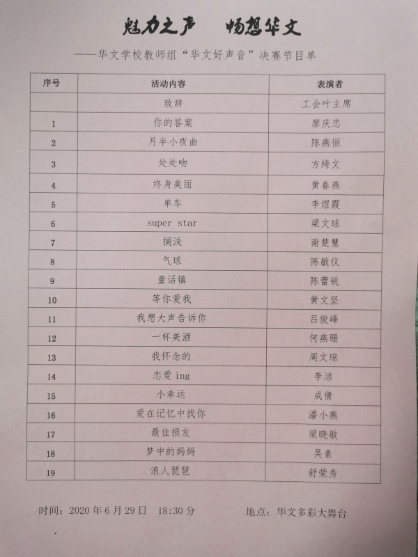 為進(jìn)一步豐富校園文化生活,努力營造積極向上、百花齊放、格調(diào)高雅、健康文明的校園文化氛圍,豐富校園師生的業(yè)余文化生活,加強(qiáng)校園精神文明建設(shè),展示華文學(xué)校團(tuán)結(jié)創(chuàng)新、銳意進(jìn)取、蓬勃向上的精神風(fēng)貌,由學(xué)校工會決定舉辦教師組“華文好聲音”歌唱大賽。