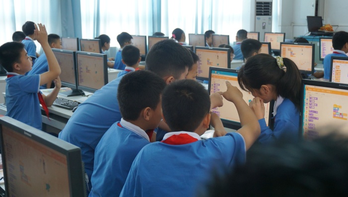 當(dāng)天的比賽內(nèi)容是四年級(jí)《信息技術(shù)》下冊(cè)第二單元《有趣的圖形化編程——麥狗賽跑》,采用“同課異構(gòu)”的形式進(jìn)行。課堂上,三位參賽老師憑著自己對(duì)教材的理解、對(duì)學(xué)生的研究和對(duì)學(xué)情的研判,教學(xué)設(shè)計(jì)八仙過(guò)海,教學(xué)過(guò)程各顯神通。黃雨蘋老師帶領(lǐng)四2班的同學(xué)參加了迷你冬奧會(huì),潘璀秀老師和四7班的同學(xué)創(chuàng)新了《龜兔賽跑》的故事,鄭子薇老師帶領(lǐng)四5班同學(xué)目睹了蘇炳添百米沖刺的輝煌時(shí)刻。教師講解、學(xué)生演示、小組合作、微課導(dǎo)航……相同的內(nèi)容,不同的教法,盡顯不同的教學(xué)風(fēng)格。黃雨蘋老師循循善誘,引領(lǐng)學(xué)生攻破一個(gè)又一個(gè)難關(guān);潘璀秀老師沉穩(wěn)大方,引導(dǎo)學(xué)生在游戲中感受新龜兔賽跑的魅力;鄭子薇老師和藹親切的肢體語(yǔ)言接近了師生之間的距離,和學(xué)生一起學(xué)習(xí)進(jìn)步。
