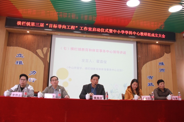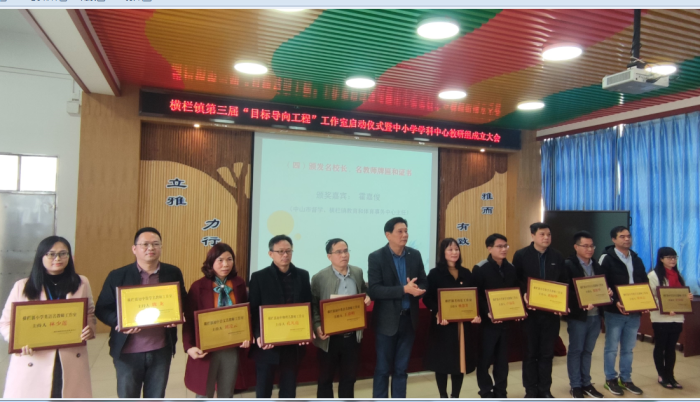 中山市督學(xué)、橫欄鎮(zhèn)教育和體育事務(wù)中心主任霍嘉俊在大會上作了講話,對榮獲橫欄鎮(zhèn)第三屆名校長、名教師、名德育干部、名班主任和學(xué)科帶頭人榮譽(yù)稱號的各位校長和老師們表示熱烈的祝賀,肯定了大家為橫欄教育事業(yè)的快速發(fā)展所作出的貢獻(xiàn)。他給主持人們提出了“四要”建議:一是要樹立堅定的教育教學(xué)信仰,不斷提升個人的專業(yè)素養(yǎng);二是要珍惜機(jī)會,抓住機(jī)遇,提升自我,爭取“實至名歸”;三是要充分展示自己的教育智慧、教學(xué)水平,在更大的范圍內(nèi)、在更深的層次上發(fā)揮好示范、帶動作用;四是要做規(guī)范辦學(xué)、推進(jìn)素質(zhì)教育的典范,做教育教學(xué)改革、教育教學(xué)創(chuàng)新的探索者。借此機(jī)會,霍嘉俊也轉(zhuǎn)達(dá)了橫欄鎮(zhèn)副鎮(zhèn)長蔡榮輝的祝福和寄語,希望大家充分利用好工作室這個發(fā)展平臺,提升自己的專業(yè)素養(yǎng),進(jìn)一步錘煉和積淀個人的教學(xué)智慧,努力在課堂教學(xué)領(lǐng)域研有所成,不斷提升個人的教學(xué)水平和科研能力,為促進(jìn)橫欄鎮(zhèn)教育發(fā)展作出應(yīng)有的努力和貢獻(xiàn)。