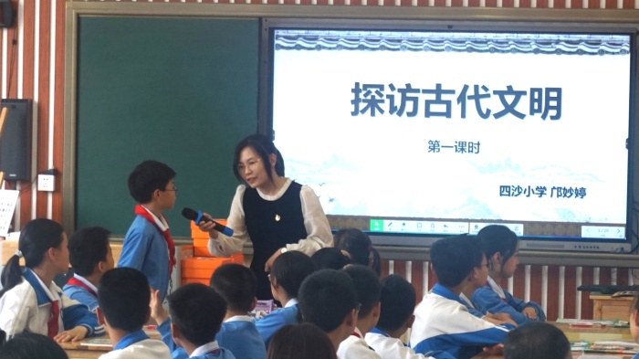 四沙小學(xué)鄺妙婷老師在智慧教室執(zhí)教了一節(jié)精彩的思政示范課例——《探訪古代文明》。鄺老師以“大河流域文明發(fā)祥地”為切入口,引導(dǎo)學(xué)生了解燦爛悠久的中華文明,并巧妙地創(chuàng)設(shè)情境“考古任務(wù)卡”開展教學(xué),讓學(xué)生在“考古”體驗活動中,以活動“考古盲盒”出土的文物為線索,結(jié)合課前網(wǎng)上搜索的資料,深入了解文物的作用,感受先民的智慧。最后,鄺老師通過視頻引導(dǎo)學(xué)生發(fā)現(xiàn)現(xiàn)代文明源于古代文明,從而培養(yǎng)學(xué)生的文化自信心,讓其為人類文明的起源和發(fā)展感到自豪和驕傲。