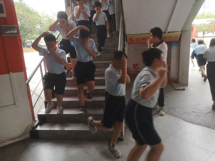 上午8:20,警鈴一響,大家各司其職,班主任帶領學生從教室按照逃生路線有序撤離;任課教師在各個樓道轉(zhuǎn)角做好防護工作,以防發(fā)生擁擠或踩傷學生的現(xiàn)象;領導小組做好后勤工作,以防途中出現(xiàn)的各種意外。在撤離過程中,學生一個個表情嚴肅,在教師的帶領下用衣物、手帕等捂住口鼻,迅速而有序地撤離到指定的安全區(qū)域。各班學生安全到達指定位置后,班主任立即清點人數(shù)并逐級上報。