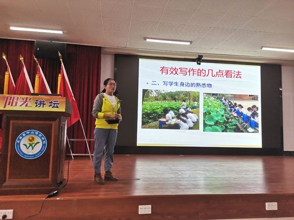 講座中黃老師介紹了馬新中學的基本情況,比如學生都是來自于農(nóng)村和外來工子弟,這和紅光學校也有相似之處,一下拉近了大家的心理距離。黃彩媚老師重點介紹了有效開展科組教研活動的具體操作方式。她說教研活動要充分發(fā)揮備課組作用才能更好的提高同科組的教學質(zhì)量,并介紹了馬新中學各科組開展的豐富多彩的學生活動,如手抄報、知識競賽、猜謎語、演講等活動。黃老師還給根據(jù)自己的教學經(jīng)驗,介紹了激發(fā)學生學習斗志的方法和具體操作過程。