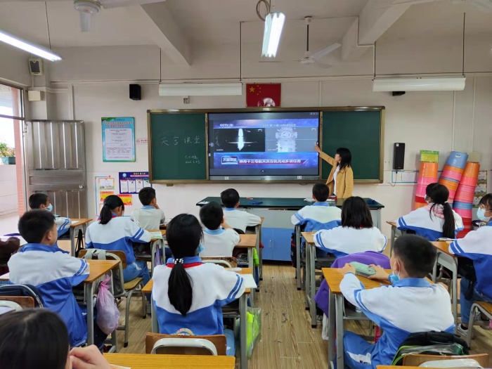 科學(xué)實(shí)驗之后,航天員們邀請直播間的小朋友們參觀了空間站里的科學(xué)設(shè)施。航天員們?yōu)橥瑢W(xué)們介紹了核心艙高微重力、無容器實(shí)驗機(jī)柜,展示本次任務(wù)中開展的空間科學(xué)實(shí)(試)驗進(jìn)展。最后,天地互動,航天員們和地面課堂的小學(xué)生們聊天互動。很快,知識豐富,趣味十足的天宮課堂就下課了,新沙小學(xué)的學(xué)生們意猶未盡。