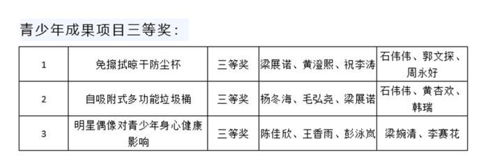本次大賽由市科協(xié)、市教體局、市科技局、團市委、市文明辦聯(lián)合主辦,根據(jù)大賽競賽規(guī)則,經(jīng)評審委員會評審,共評出獲獎項目397項。其中,科技創(chuàng)新成果項目一等獎63項、二等獎86項、三等獎154項;優(yōu)秀輔導(dǎo)員科技創(chuàng)新成果項目一等獎15項、二等獎22項、三等獎37項;十佳優(yōu)秀科技教師10名;優(yōu)秀組織獎10項。