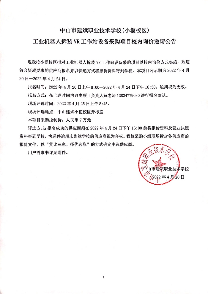 中山市建斌職業(yè)技術(shù)學(xué)校(小欖校區(qū))工業(yè)機(jī)器人拆裝VR工作站設(shè)備采購(gòu)項(xiàng)目校內(nèi)詢價(jià)邀請(qǐng)公告