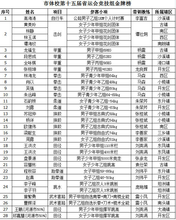 公路自行車男乙1KM個(gè)人計(jì)時(shí)金牌:高海濤 帶訓(xùn)教練:李富吉 輸送鎮(zhèn)區(qū):沙溪