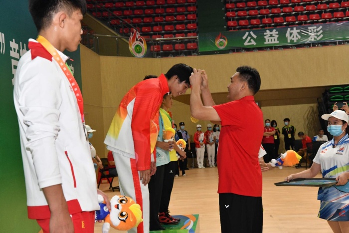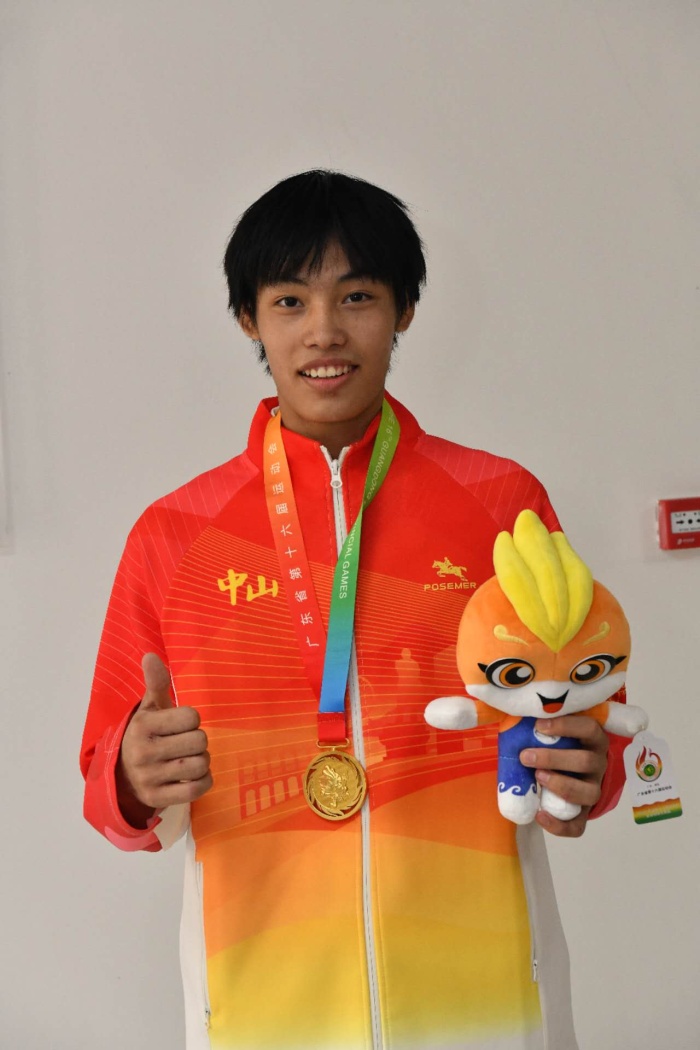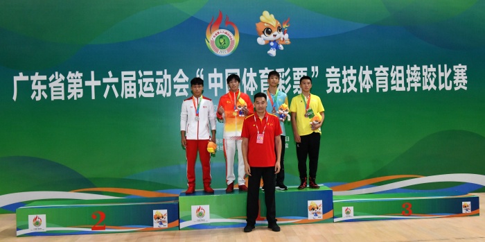 這是韋海龍首次參加省運(yùn)會(huì)比賽,他的內(nèi)心充滿了對(duì)冠軍的渴望。在前兩日的比賽中,隊(duì)友們連奪兩金,這既是對(duì)他最大的鼓勵(lì),但同時(shí)也給他帶來了巨大的心理壓力?!靶睦韷毫νΥ蟮?,總是想著比賽的事情。但教練說過的‘把訓(xùn)練當(dāng)比賽,把比賽當(dāng)訓(xùn)練’,讓我卸下了思想包袱,心里踏實(shí)了許多。”韋海龍賽后談到了此次比賽的感受。但令他意想不到的是,自己會(huì)以如此懸殊的比分把人生的首個(gè)省運(yùn)會(huì)冠軍收入囊中。賽后,現(xiàn)場(chǎng)觀賽的中山市教體局陳威副局長(zhǎng)為冠軍得主韋海龍頒發(fā)金牌。