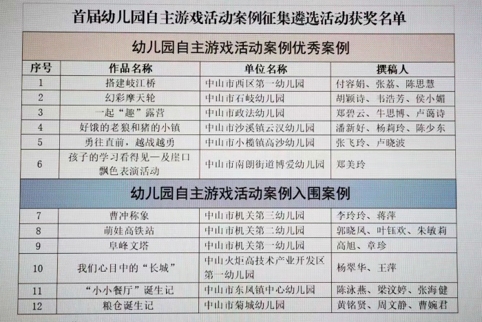 2023年5月5日,在廣東省教育廳公布的《廣東省首屆幼兒園自主游戲活動案例和幼小銜接活動方案征集遴選結(jié)果》中,中山市有12個自主游戲活動案例和10個幼小銜接案例榜上有名。據(jù)了解,全省共遴選出自主游戲活動優(yōu)秀案例86篇,入圍案例138篇;幼小銜接活動優(yōu)秀方案80篇,入圍方案145篇。中山市此次選送自主游戲活動案例15個,其中6個獲評優(yōu)秀案例,6個獲評入圍案例;選送幼小銜接活動方案15個,其中6個獲評優(yōu)秀方案,4個獲評入圍方案(獲獎名單見附件)。