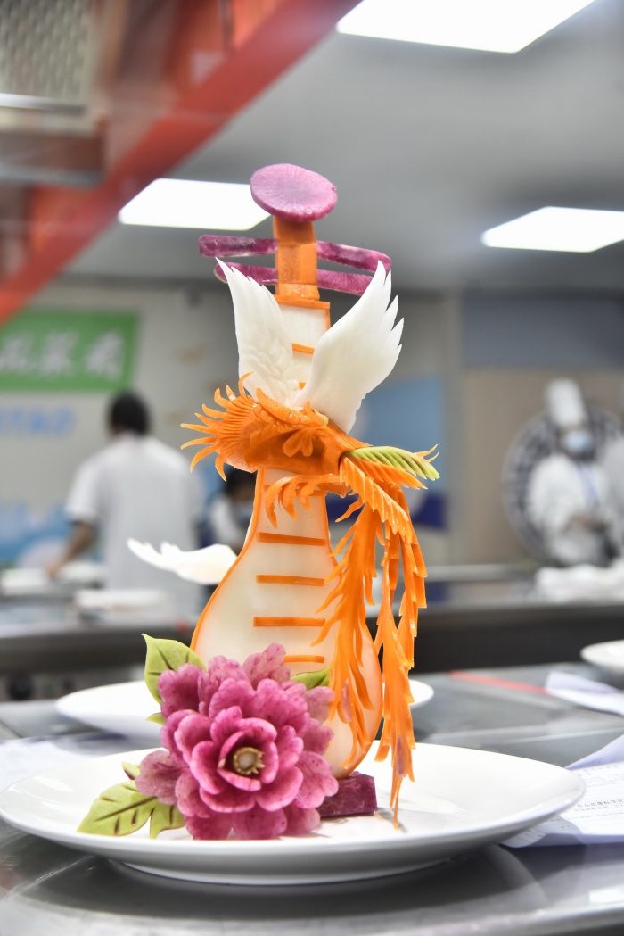 比賽凸顯職教特色,為省內(nèi)各中職學(xué)校之間專業(yè)建設(shè)提供交流與成果檢驗(yàn)的平臺(tái)。烹飪賽項(xiàng)由理論和實(shí)操兩大項(xiàng)目組成,實(shí)操項(xiàng)目分為四個(gè)模塊:粵菜制作、廣點(diǎn)制作、主題拼盤和食品雕刻,主要考察選手對(duì)粵菜、廣點(diǎn)基本功的知識(shí)和技能掌握程度。模塊一:粵菜制作,參賽選手在 115 分鐘內(nèi)完成五彩炒雞絲、骨香鴿片和自選作品制作;模塊二:廣點(diǎn)制作,參賽選手在 150分鐘內(nèi)完成提褶包、嶺南酥皮作品(烤制)和自選作品的制作;模塊三:主題拼盤制作,參賽選手在63分鐘內(nèi)完成剞切蓑衣黃瓜和自選作品的制作;模塊四:食品雕刻,參賽選手需要在67 分鐘完成基本功作品月季花和自選作品的制作。自選作品需符合地方粵菜飲食文化特色和烹飪技法特點(diǎn),展示選手技術(shù)創(chuàng)新和學(xué)以致用方面的技巧與能力。