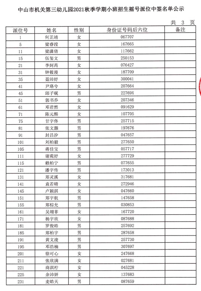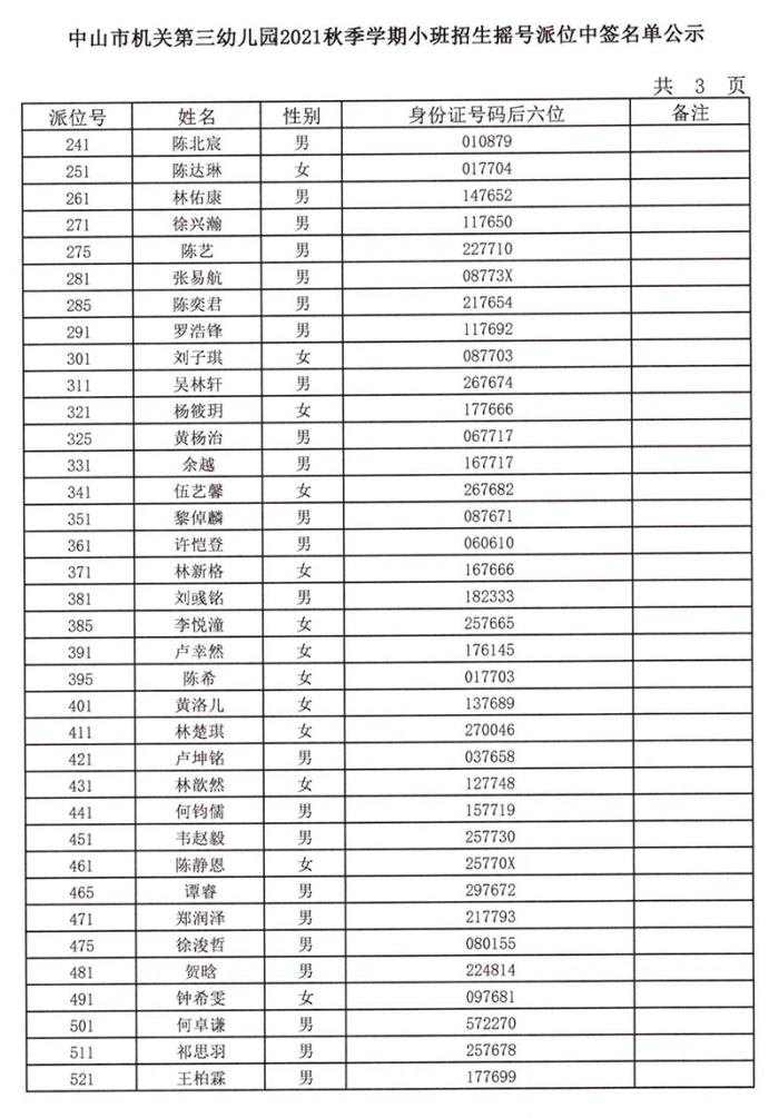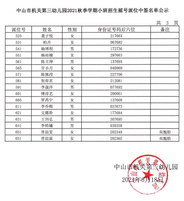 中山市機(jī)關(guān)第三幼兒園2021年秋季學(xué)期小班招生搖號派位中簽名單公示