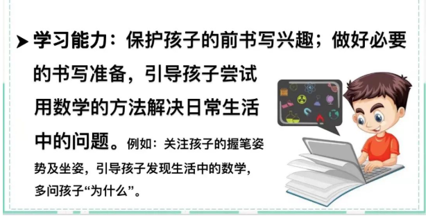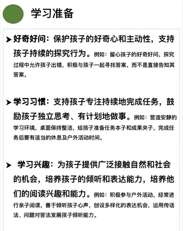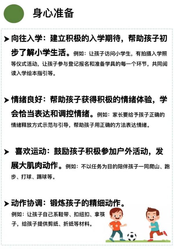 為讓家長(zhǎng)更好地開(kāi)展幼小銜接家庭教育工作,我園整理了身心準(zhǔn)備、生活準(zhǔn)備、社會(huì)準(zhǔn)備、學(xué)習(xí)準(zhǔn)備四方面的家庭版本指南供家長(zhǎng)參考。