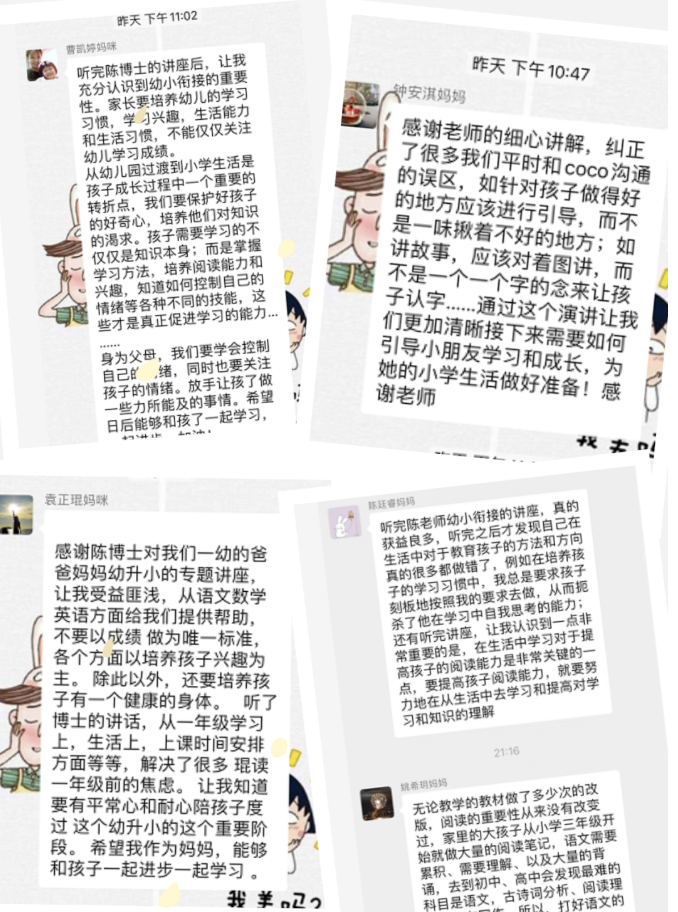 會(huì)后,家長(zhǎng)們紛紛發(fā)布學(xué)習(xí)感言,表示陳博士的分享為他們指明了幼小銜接家庭教育的方向,也糾正了她們一些不正確的觀念,消除了焦慮。