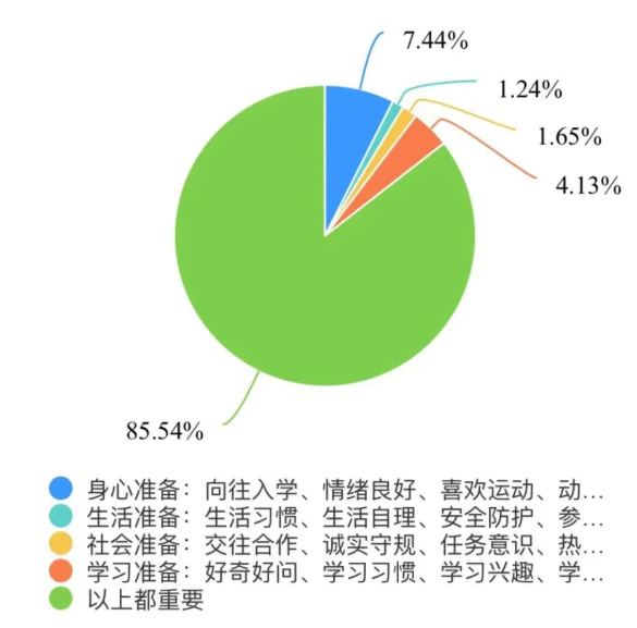 調(diào)查結(jié)果顯示,85.54%的家長(zhǎng)認(rèn)為,幼小銜接中的身心準(zhǔn)備、生活準(zhǔn)備、社會(huì)準(zhǔn)備、學(xué)習(xí)準(zhǔn)備四個(gè)方面都很重要,不能偏向于只在某一方面進(jìn)行銜接,可見(jiàn)一幼家長(zhǎng)具備一定的科學(xué)幼小銜接理念。