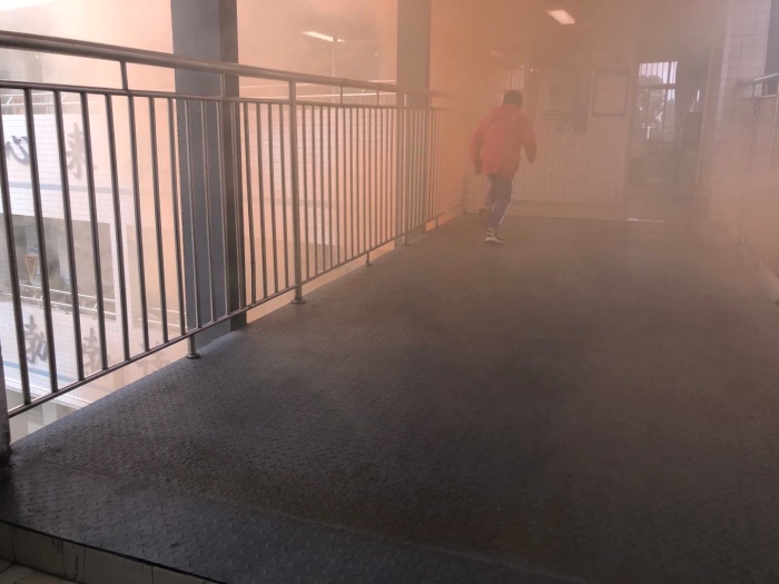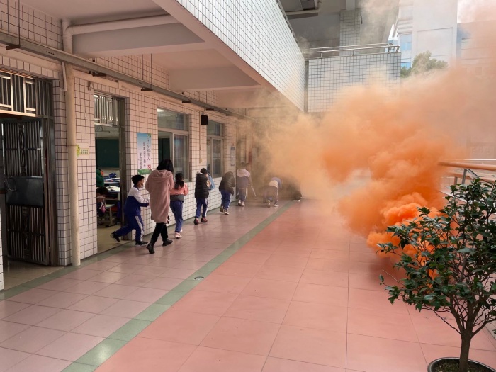 濃煙彌漫,急促的警報(bào)聲響起,全體師生按照演練方案即刻就位。負(fù)責(zé)疏散通道的老師們迅速到達(dá)指定崗位,班主任老師組織學(xué)生有序地撤離教室,指揮學(xué)生拿起濕毛巾捂住口鼻,彎下身子沿指定路線有序撤離,整個(gè)過程井然有序、行動(dòng)迅速,各班以最快的速度順利抵達(dá)安全區(qū)域,并整隊(duì)清點(diǎn)人數(shù),向級(jí)組長(zhǎng)匯報(bào)。