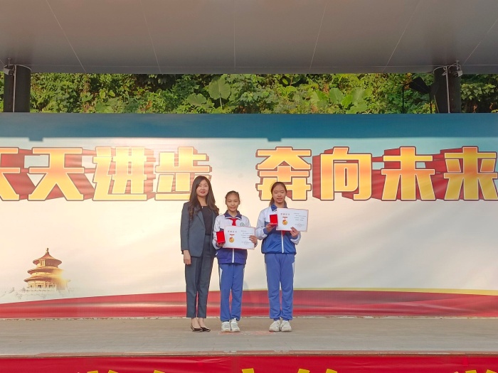 伴隨著激昂的頒獎音樂,獲三星章的隊(duì)員們精神抖擻,意氣風(fēng)發(fā)地走上了領(lǐng)獎臺。鄭康樂副校長、黃桂芬主任為他們一一頒發(fā)了獎?wù)?。緊接著,在全校師生熱烈的掌聲下,馮麗芬校長為四星章獲獎隊(duì)員頒發(fā)證書以及獎?wù)隆?/p>