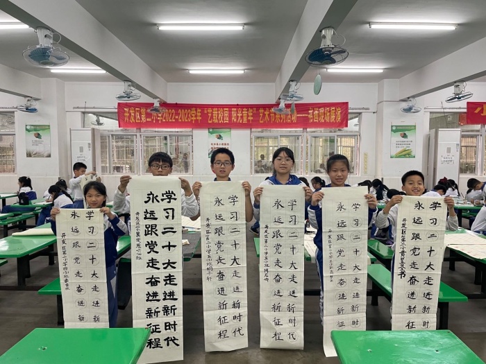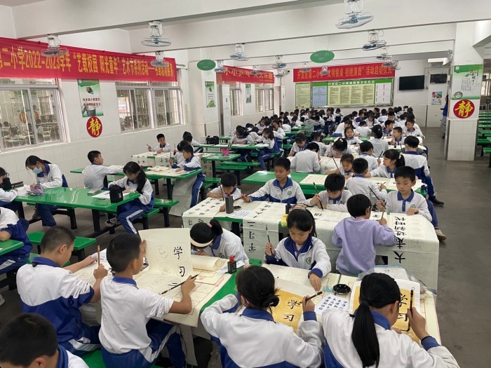 為深入學(xué)習(xí)貫徹黨的二十大精神,培養(yǎng)學(xué)生愛黨愛國的思想情懷,給學(xué)生提供一個展示自我的平臺,激發(fā)學(xué)生對于書畫藝術(shù)的熱愛,在校園內(nèi)營造書畫創(chuàng)作的氛圍,豐富和活躍學(xué)生校園文化生活,開發(fā)區(qū)第二小學(xué)于2023年3月30日下午在校內(nèi)舉辦了2022-2023學(xué)年“藝載校園 陽光童年”藝術(shù)節(jié)系列活動——現(xiàn)場書畫比賽。