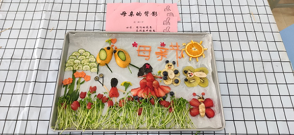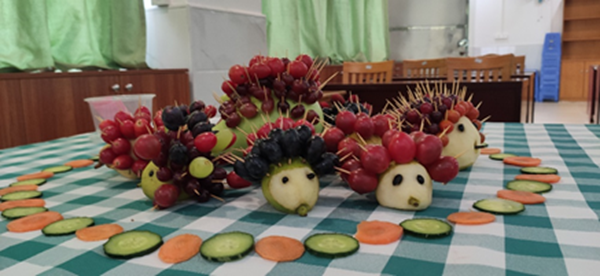 面對琳瑯滿目、五彩繽紛的新鮮蔬果,心靈手巧的同學(xué)們可謂胸有成竹,你剝他切,我掰他刻,個(gè)個(gè)全神投入。一陣陣歡聲笑語后,作品漸漸出爐,同學(xué)們呈現(xiàn)出來的作品可謂匠心獨(dú)運(yùn),讓人大飽眼福,花朵娃娃笑逐顏開、小雞刺猬形態(tài)神似,每個(gè)拼盤都細(xì)致精巧,美不勝收。