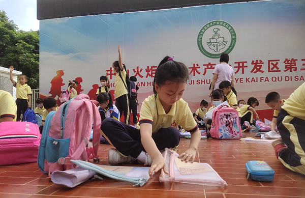 2022年5月9日,三小的“快樂大課間”勞動技能比賽在鳳凰臺開始了。一年級的比賽項目是整理書包。隨著老師的一聲令下,孩子們將被評委老師打亂順序的一本本書、作業(yè)本、文具等按照一定的順序整理好裝進書包。比賽過程中孩子們積極參與,熱情高漲,他們有的是按照順序先整理好然后再一起裝進書包,有的是一本一本的放進書包,雖然稍慢一點,但也能在規(guī)定的時間里把書包整理整齊,拉好拉鏈,背在肩上。