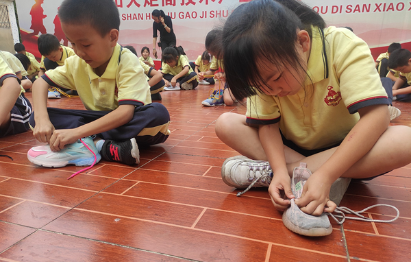 二年級則是系鞋帶競賽。比賽中,各班班主任帶隊參賽,比賽氣氛緊張而又熱烈。孩子們的小手在上下翻飛,一個個漂亮的蝴蝶結(jié)在手指的飛舞中誕生了,完成比賽任務(wù)的孩子昂著紅紅的笑臉,那感覺是自信又自豪。