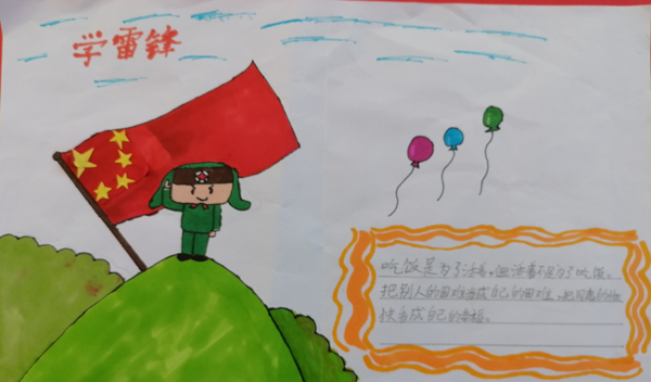各中隊(duì)除了利用少先隊(duì)活動課組織隊(duì)員開展講一個雷鋒故事、唱一首雷鋒歌曲、背一句雷鋒格言、畫一幅雷鋒畫像、看一部雷鋒電影,還組織隊(duì)員利用課后時間開展了學(xué)雷鋒志愿服務(wù)實(shí)踐活動。